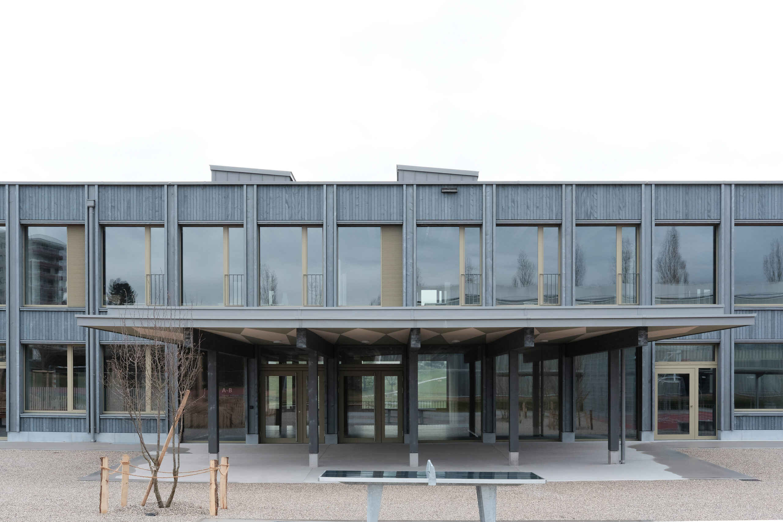 Le renouvellement d’air des salles de classe est assuré par une installation à double flux avec récupérateur de chaleur et post-chauffage de l’air. Les débits d’air des salles de classe sont régulés en fonction du taux de CO2. Les vestiaires sont également ventilés par un monobloc à double flux. Les salles de sport sont ventilées naturellement par des ouvrants mécaniques en façade et en toiture. C’est le taux de CO2 et/ou la température qui détermine la position des ouvrants.